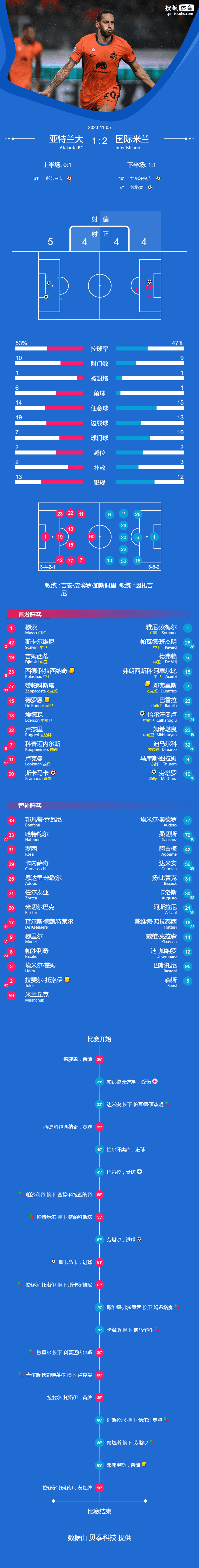 亚特兰大(3-4-1-2):1-穆索/42-斯卡尔维尼(62分钟,2-托洛伊)、19-吉姆西蒂、23-科拉希纳茨(55分钟,33-哈特鲍尔)/77-扎帕科斯塔(55分钟,8-帕萨利奇)、15-德容恩、13-埃德松-席尔瓦、22-鲁杰里/11-卢克曼(80分钟,9-穆里尔)/7-库普梅纳斯(80分钟,17-德凯特拉雷)、90-斯卡马卡