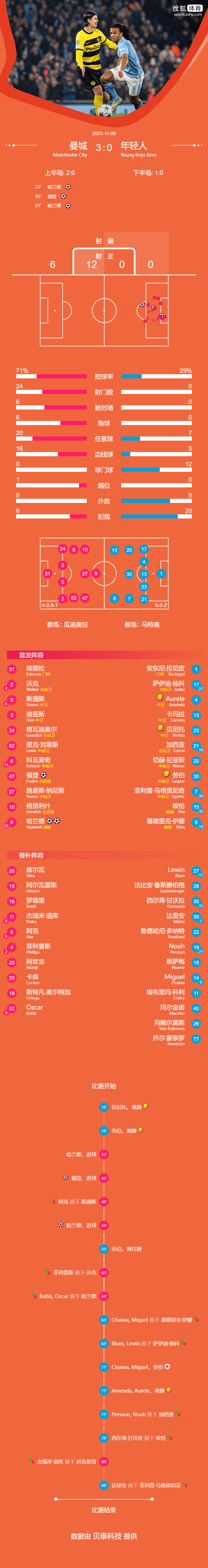 上半场,曼城由哈兰德主罚的点球和福登的进球,以2-0的比分领先伯尔尼年轻人。下半场,哈兰德再次建功,锁定了比赛胜局。比赛末段,伯尔尼年轻人的劳珀被红牌罚下,使客队陷入十人应战的困境。最终,曼城以3-0战胜对手,提前确保了小组赛晋级。